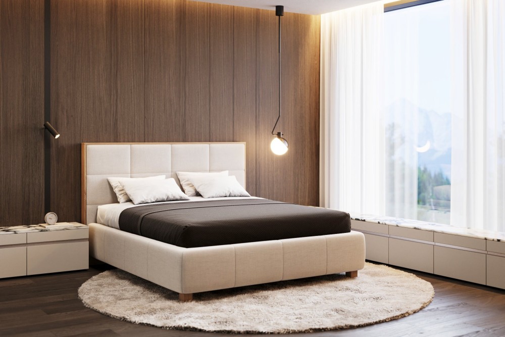 Bočnice postele sú prešité v rovnakom štýle ako čelo, čím vzniká harmonický a prepracovaný dizajnový celok. Celkový dojem umocňuje elegantná obruba z masívneho dubového dreva, ktorá lemuje čelo a zvýrazňuje prémiový charakter tohto modelu.