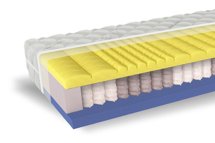 Ortopedický 7-zónový matrac s antibakteriálnou penou SANITIZED Jadro matraca tvorí taštičková pružina Punktoflex so systémom rozloženia zón 7Fyzio, vďaka ktorému je matrac pod ramenami a kolenami mäkší a pod chrbtom pevnejší. V kombinácii s tvrdšou antibakteriálnou penou SANITIZED poskytuje matrac pevnú oporu pre chrbát a prináša vysoký ortopedický efekt. K vysokej miere hygieny prispieva poťah SILVER GUARD s obsahom striebra, ktorý je snímateľný a prateľný pri teplote do 60 °C.
