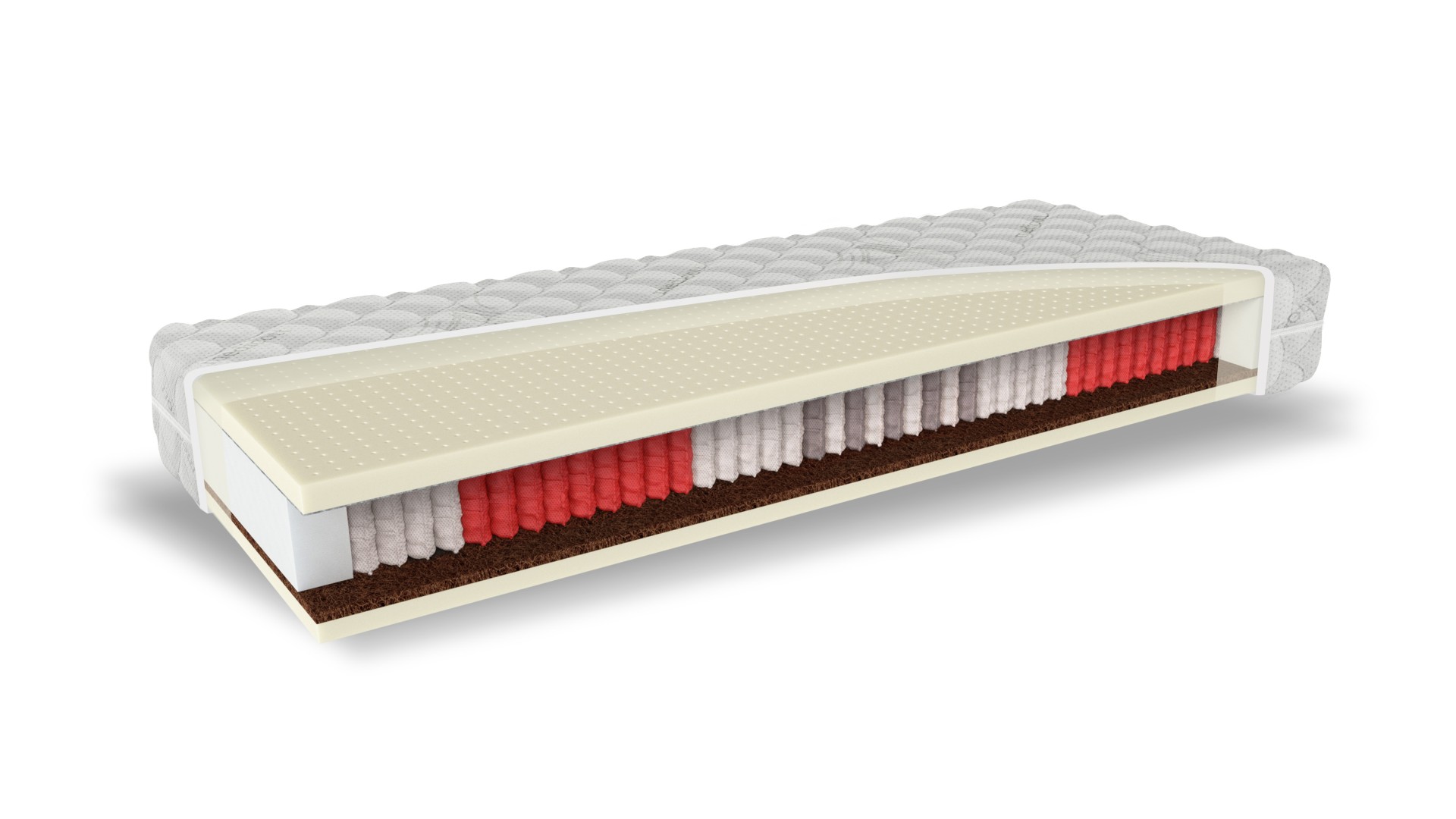 Prémiový matrac s 500 mikropružinkami na m². Prémiový matrac z prírodných materiálov s taštičkovou pružinou MICROPOCKET a zónovou technológiou 7Fyzio. Latexová pena PREMIUM a pružné kokosové vlákno FlexiKokos sa postará o pohodlný a zdravý spánok. Zónová pružina optimálne podporí všetky časti tela.