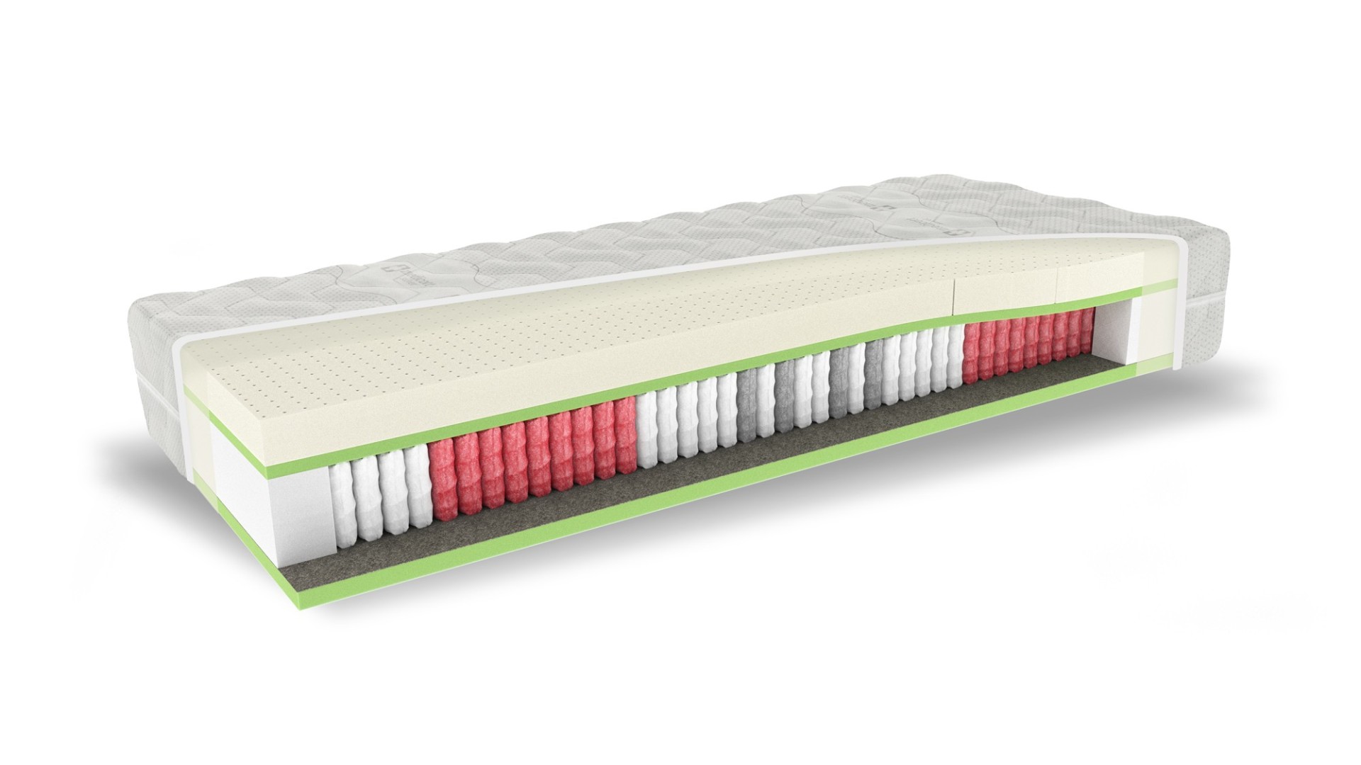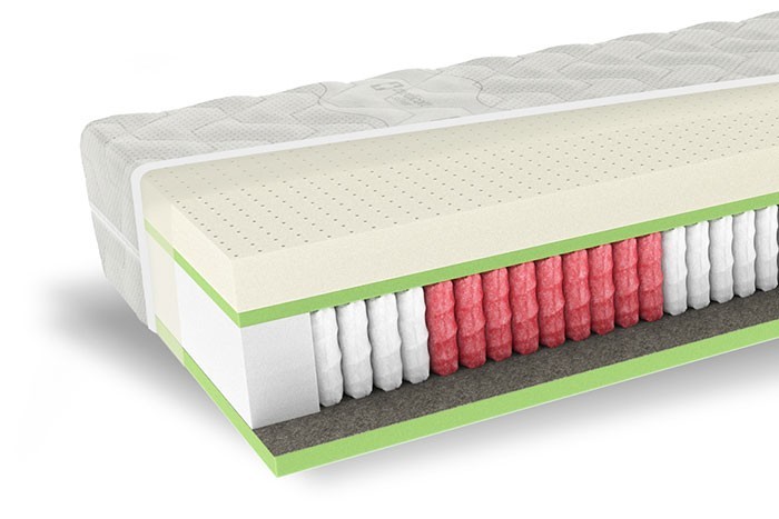 LATEXOVÁ PENA PREMIUM - hustota 70 kg/m³ Pena SENSIO, KOMFORTNÁ PENA, hustota 40 kg/m³ LISOVANÁ BAVLNA, CHRÁNIČ PRUŽINY PUR BOČNÍKY - hustota 35 kg/m³ PRUŽINA MICROPOCKET S1000 7FYZIO - 500 pružiniek na m² Pena SENSIO, KOMFORTNÁ PENA, hustota 40 kg/m³ ELASTICKÁ TEXTÍLIA NA OCHRANU JADRA SNÍMATEĽNÝ A PRACÍ POŤAH
