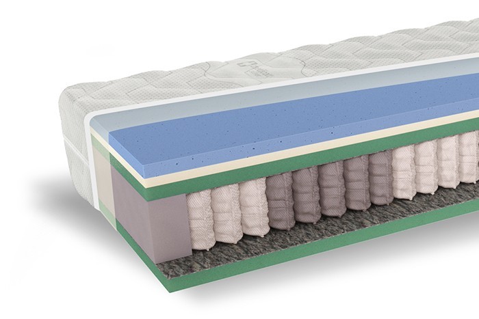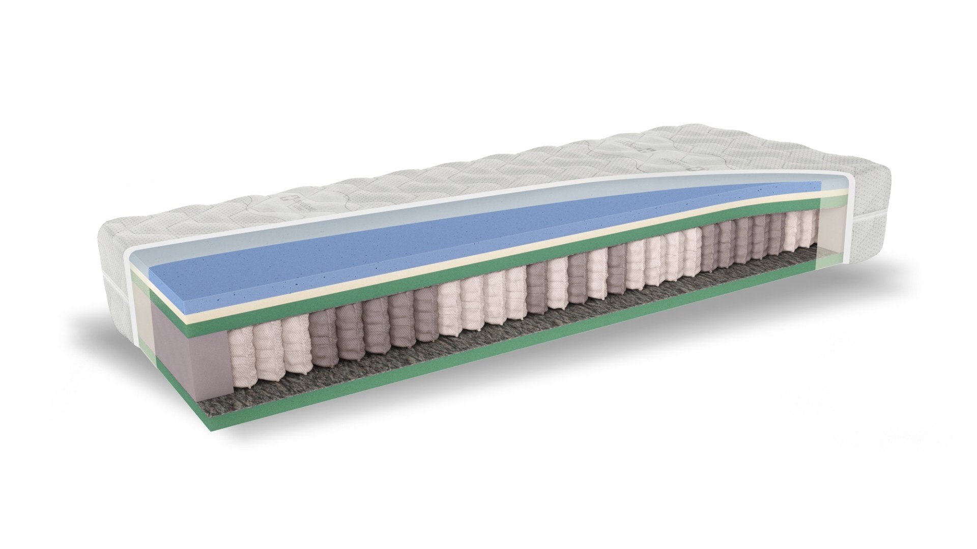 THERMOFRESH, chladivá gélová pena, 60 kg/m³ LATEXOVÁ PENA PREMIUM - hustota 70 kg/m³ SATIN , KOMFORTNÁ pena, hustota 40 kg/m³ LISOVANÁ BAVLNA - chránič pružiny PUR BOČNÍKY - hustota 35 kg/m³ PRUŽINA PUNKTOFLEX S500 7FYZIO - 250 pružiniek na m² LISOVANÁ BAVLNA - chránič pružiny SATIN , KOMFORTNÁ pena, hustota 40 kg/m³ ELASTICKÁ TEXTÍLIA NA OCHRANU JADRA SNÍMATEĽNÝ A PRACÍ POŤAH