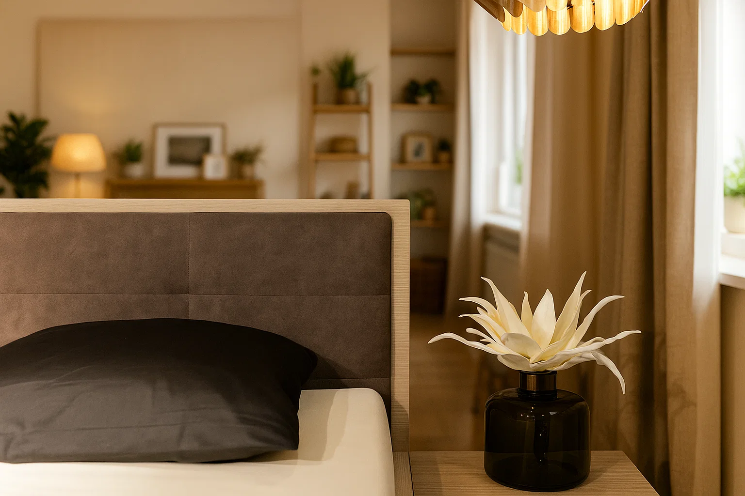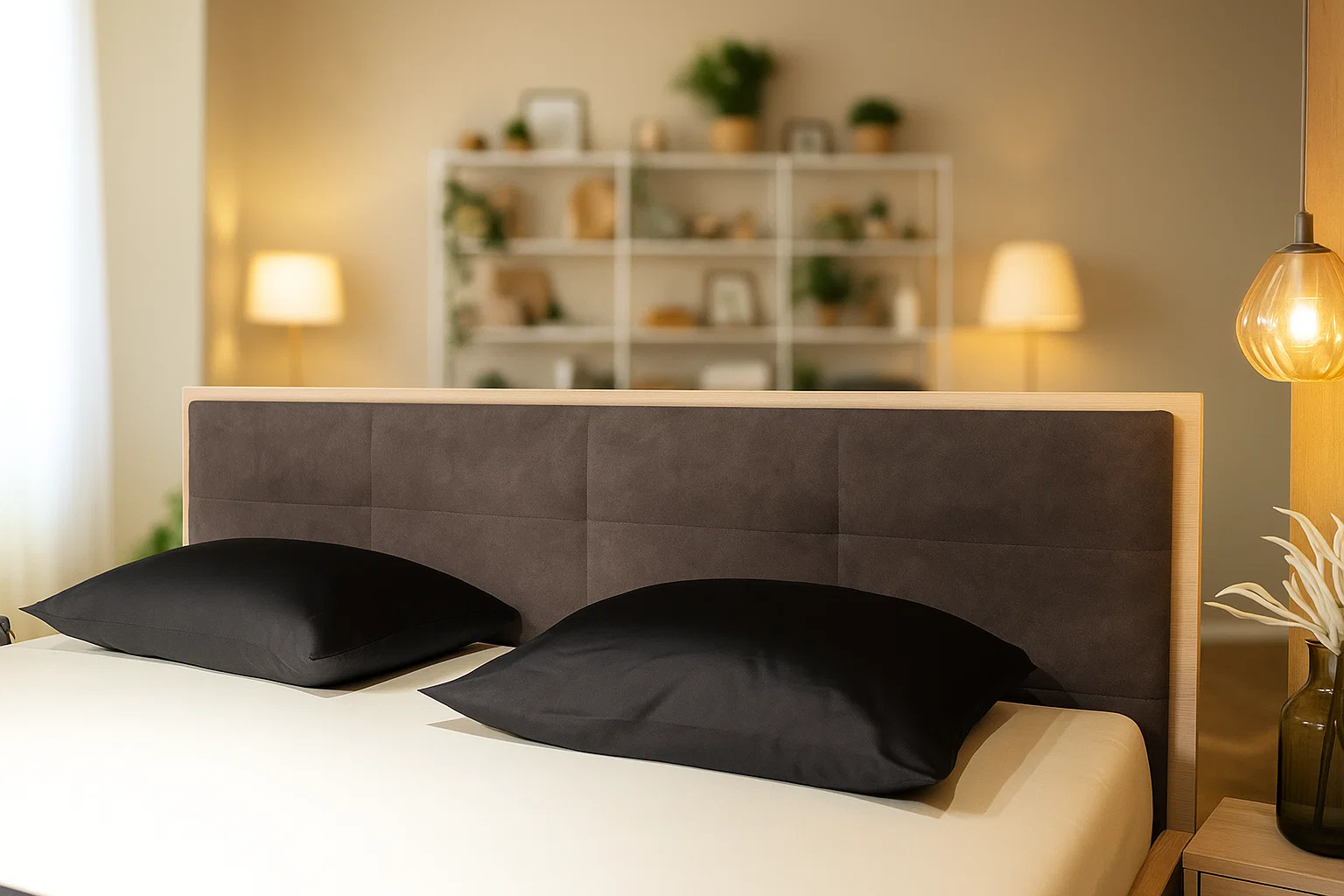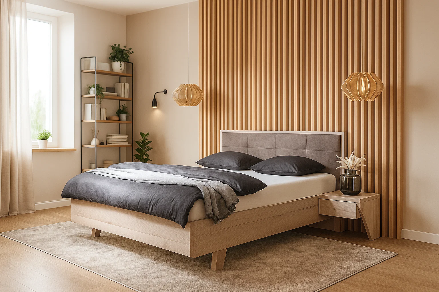 Štýlová dizajnová posteľ so šikmými nohami a praktickým úložným priestorom, vhodná aj do priestorov s podlahovým kúrením. Jej dominantou je mäkké, čalúnené čelo pre maximálne pohodlie pri opretí.