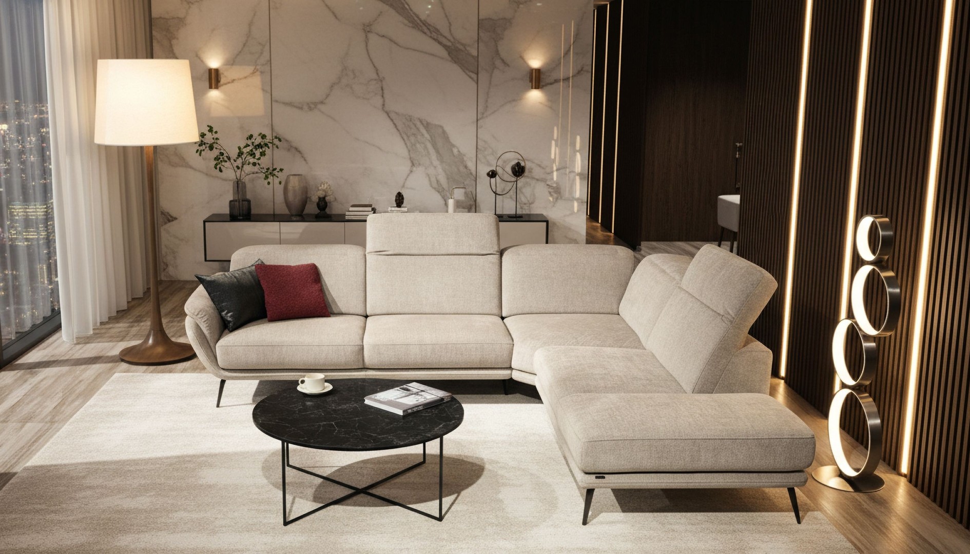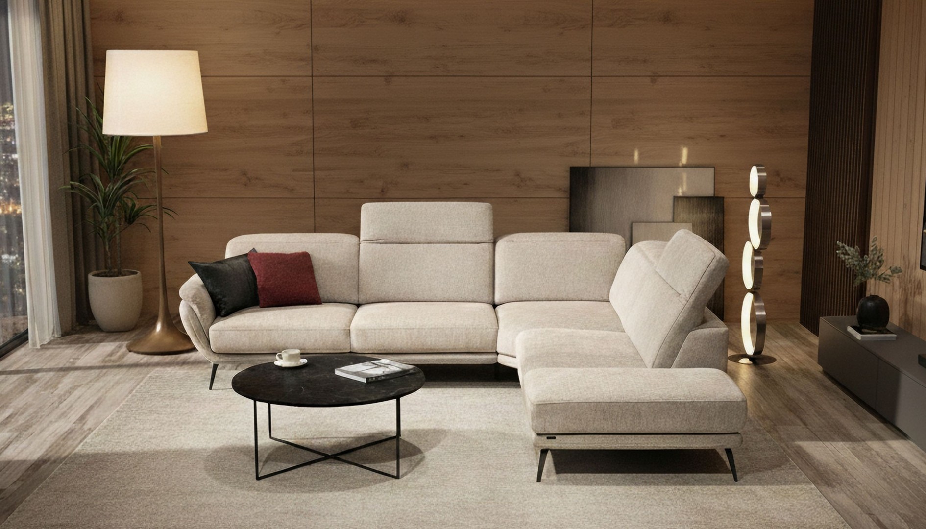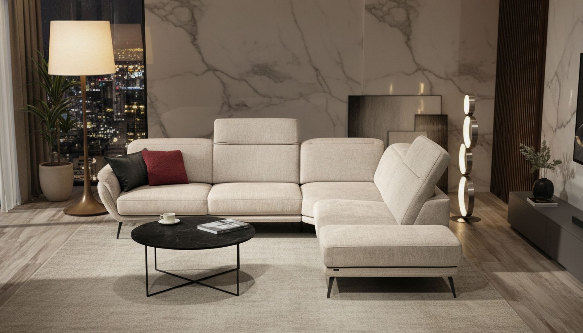 Rohová sedačka na elegantných kovových nožičkách zaujme svojimi jemne zaoblenými tvarmi a moderným dizajnom. Vysoký komfort pri sedení zabezpečujú polohovateľné opierky hlavy a možnosť prehĺbenia sedákov pomocou motorického vysunutia. Sedačka má rozmery vhodné aj do menších bytov, kde ponúkne maximálne pohodlie bez kompromisov v kvalite sedenia.