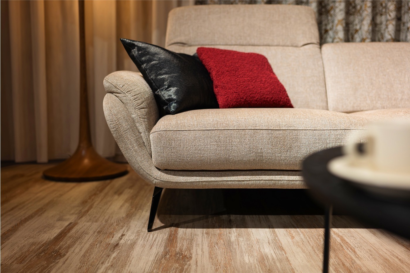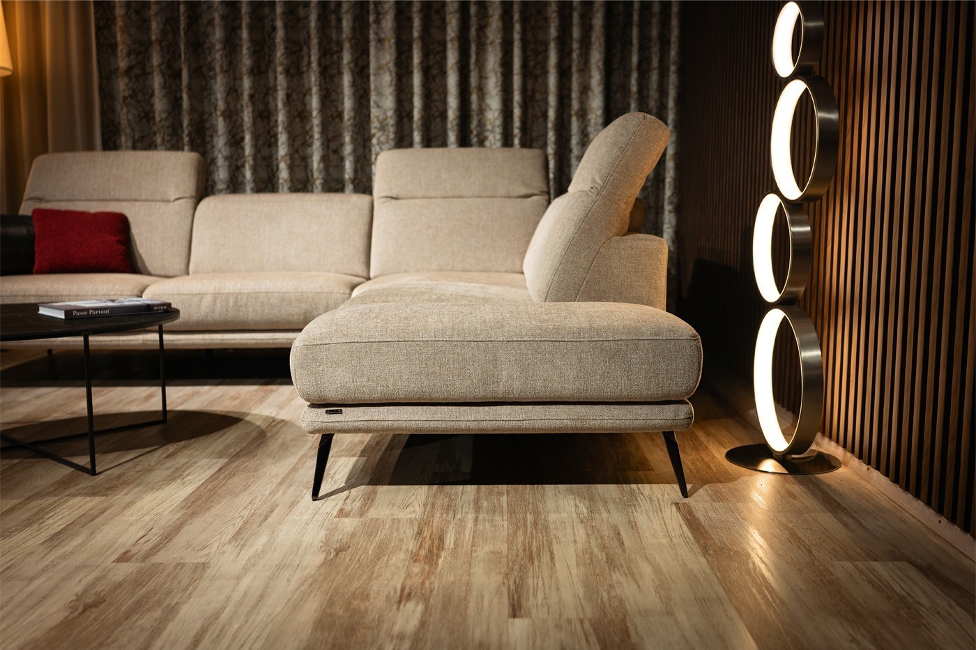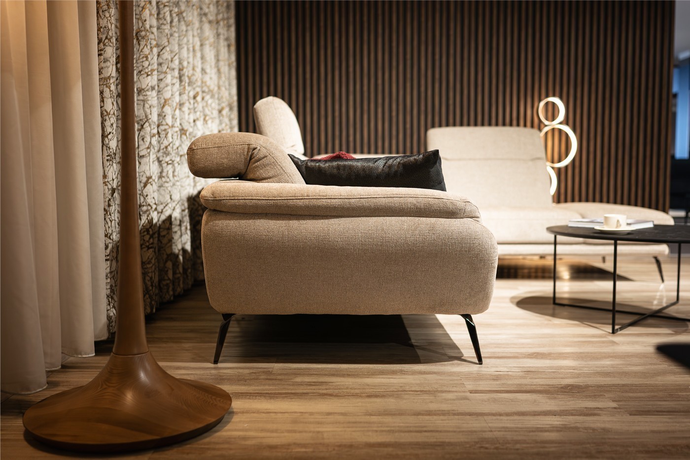 Rohová sedačka na elegantných kovových nožičkách zaujme svojimi jemne zaoblenými tvarmi a moderným dizajnom. Vysoký komfort pri sedení zabezpečujú polohovateľné opierky hlavy a možnosť prehĺbenia sedákov pomocou motorického vysunutia. Sedačka má rozmery vhodné aj do menších bytov, kde ponúkne maximálne pohodlie bez kompromisov v kvalite sedenia.